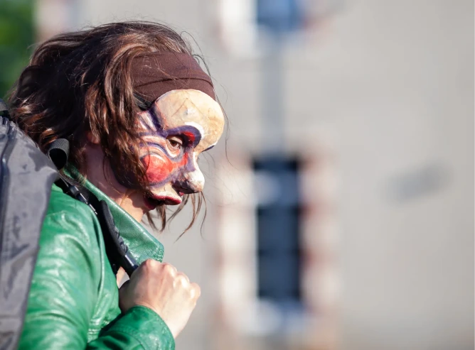 Ici, pas de masque FFP2 mais un masque de théâtre qui crée l’étonnement.